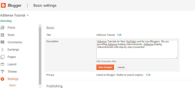 Under Settings>> you can see Title>> Description>> In Description you have to put your blog’s main description including main keywords, target keywords & related keywords with your Blog. (As showing in below picture)